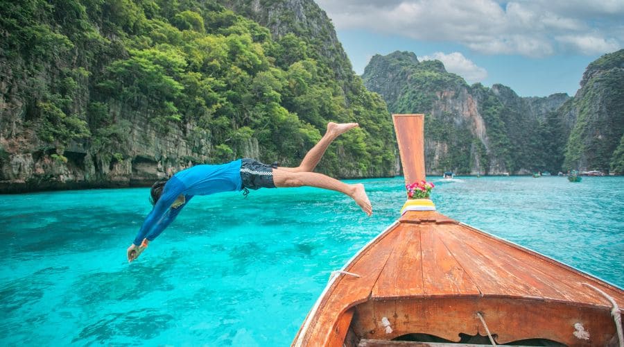 Relaxing and swimming in emerald lagoon at Pileh Lagoon. Enjoy sea activities paddle board or sightseeing by long tail boat.(Optional, extra charge)